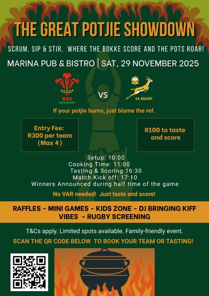 Front RowEvents & Marina Pub & Bistro is serving a full-day flavour fest on Saturday, 29 November 2025, just in time for Wales vs Springboks. Scrum, sip, stir… and show the crowd what your potjie game is made of.